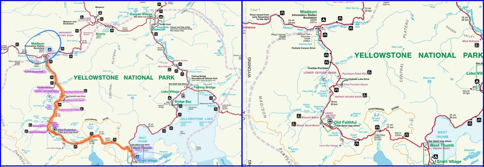 Nous quittons le Madisson campground pour nous diriger vers le Grant Village campground. De cette façon nous pourrons voirles nombreuses attractions                         (en violet sur la carte) sans devoir revenir sur nos pas.