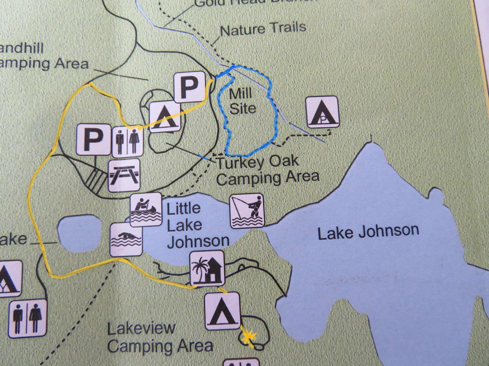 On peut vous affirmer, qu’à notre grande surprise, les sites de camping sont presque tous occupés au Lakeview Camping Area où nous sommes installés. Pourquoi sommes nous si surpris ? Tout simplement parce que malgré les nombreuses installations, maisonnettes, « picnic area » lacs, trails, il n’y a personne en ACTIVITÉ à l’extérieur. L’incitatif n’est pas vraiment là !!! Le niveau des lacs est très bas, ils sont couverts en grande partie d’herbes, de nénuphars etc. De plus, les trails semblent être plus des trails de « trappeurs » au temps de la colonisation que des sentiers de randonnée...