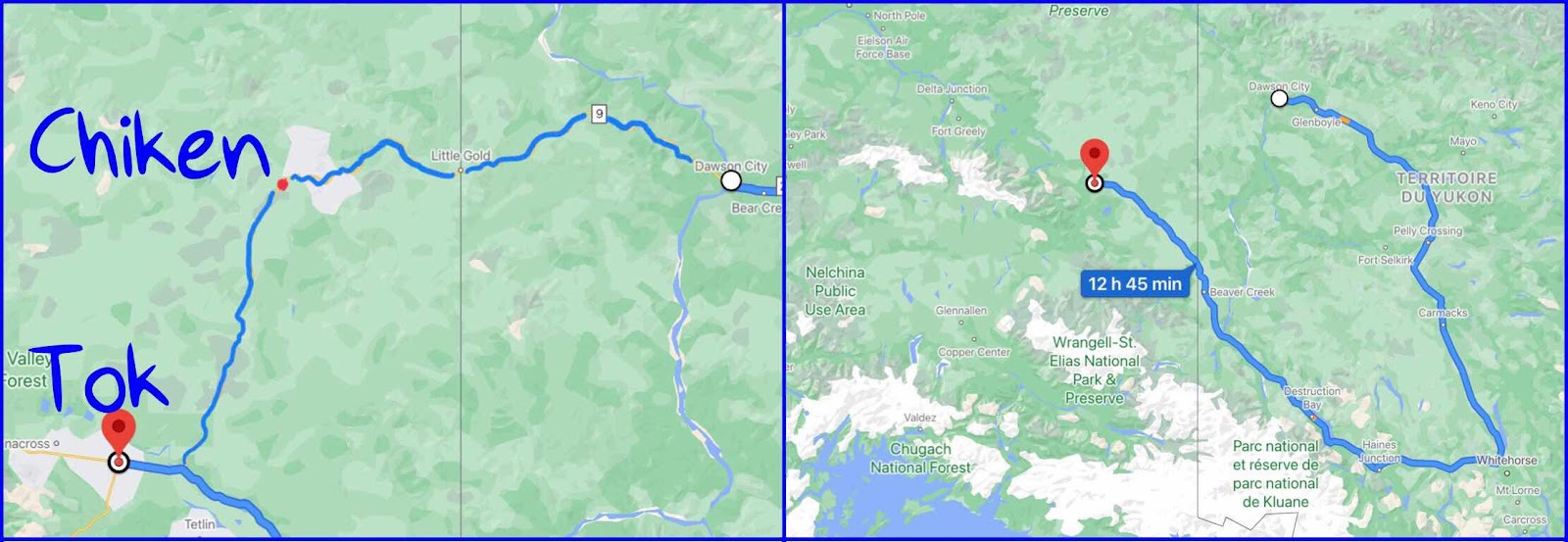 Nous retrouvons, finalement et avec un grand soupir de soulagement, la chaussée asphaltée aux abords de Chicken. Oui, chicken comme poulet ! C’est un petit bled d’une population qui avoisine 20 personnes ... Wow !!! Nous sommes arrivés en VILLE...
